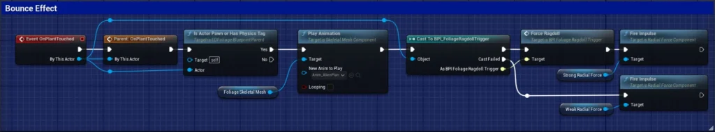 If the cast succeeded, we trigger the Force Ragdoll event to make compatible actors flop around as if they have been bounced. Then we fire an impulse to send them flying.