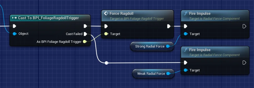 If the cast failed, it means the actor that touched the foliage does not have our BPI_FoliageRagdollTrigger in its class, so we cant trigger ragdoll. Instead we just fire an impulse to send them flying.