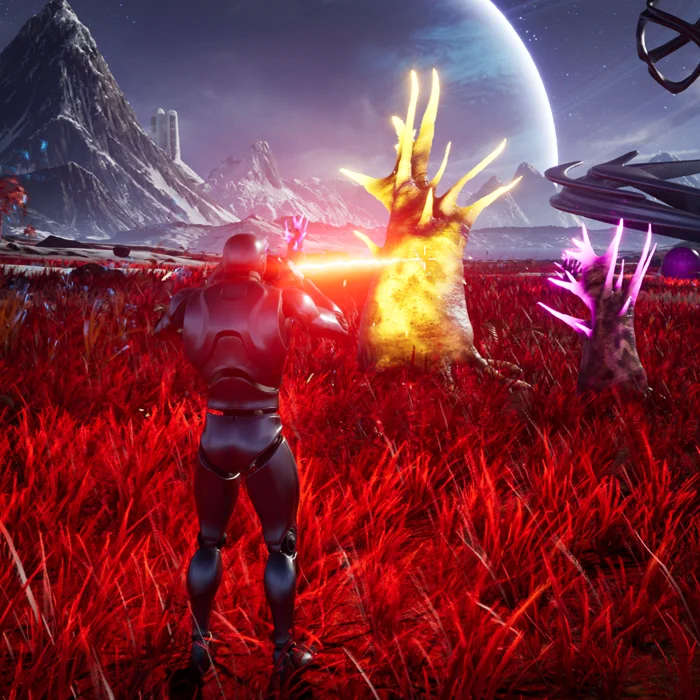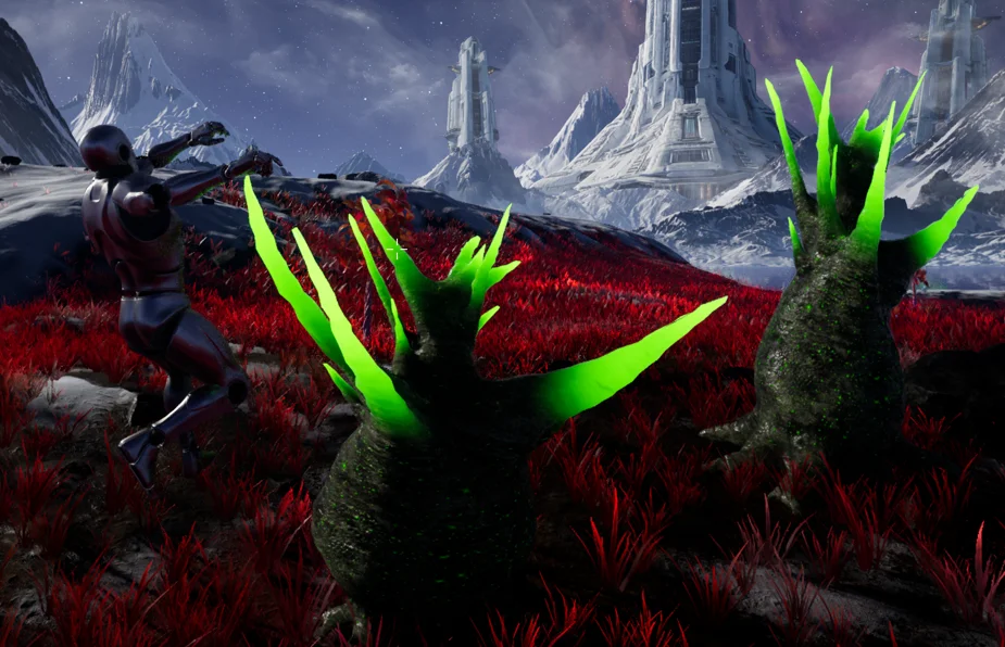 In the example found in BP_AlienPlant, we had logic that animated the foliage’s material when hit by a beam weapon.