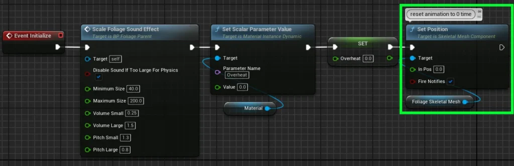 The Initialization of a skeletal mesh animaiton only requires that it be set back to its original state. In this example, we get the Foliage Skeletal Mesh and use the Set Position node to ensure its animation timeline is reset to 0 seconds.
