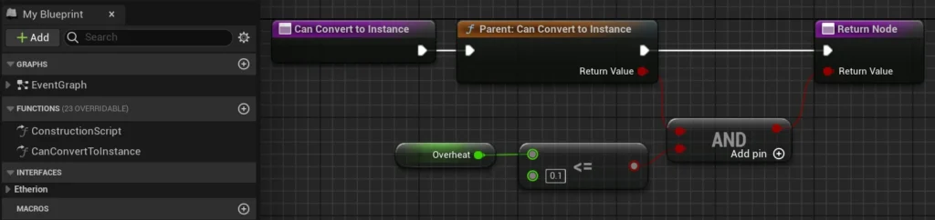 We used the CanConvertToInstance node to ensure that it did not convert back into a foliage until the Overheat variable was 0.1 or less