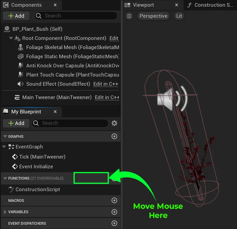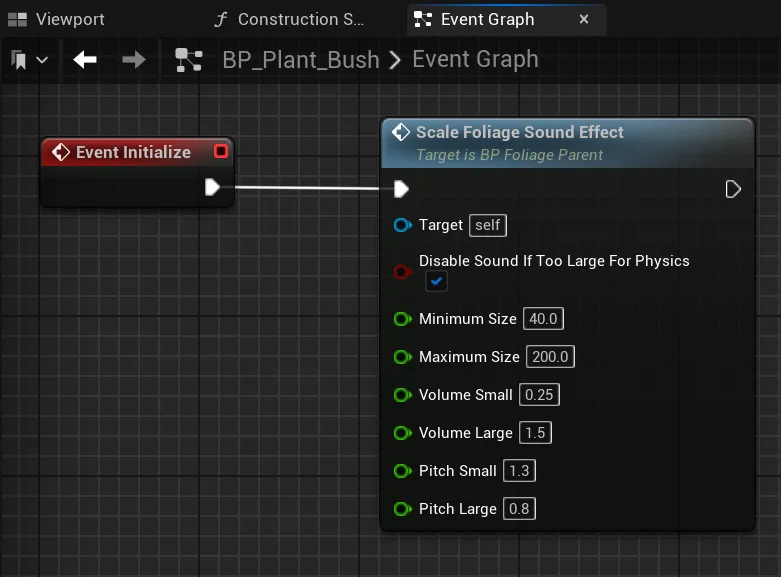 For this blueprint, we needed the sound effect to change based on the foliage’s size. There will be plenty of foliage instances painted in the level, each varying in size.