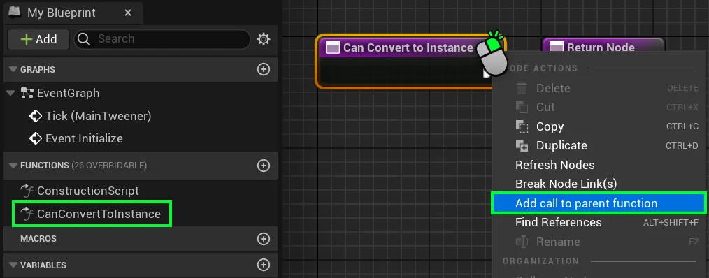 Once opened, you will want to right click the “Can Convert to Instance” entry node, and click “Add call to parent function“.