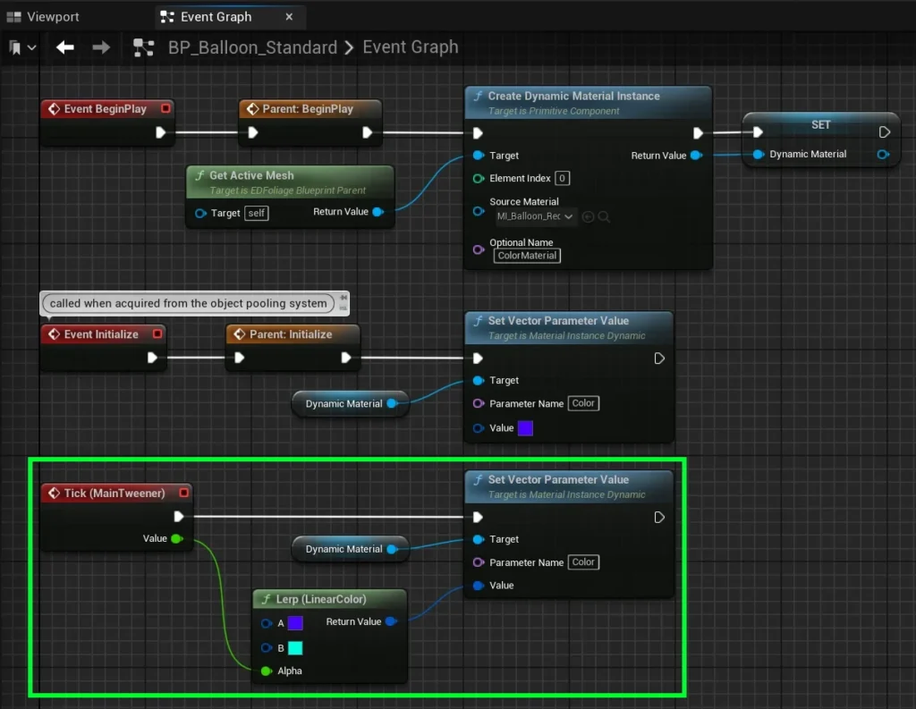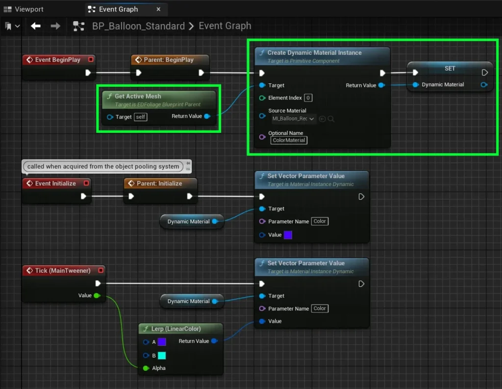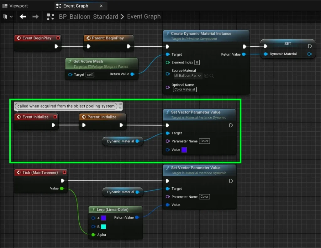 Finally, the Event Initialize node must reset the Dynamic Material to its default color. This ensures that each time a foliage blueprint is pulled from the Object Pool, its animation starts from the beginning, with the material color correctly matching the foliage’s default appearance.