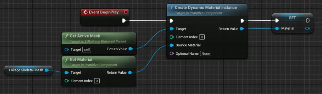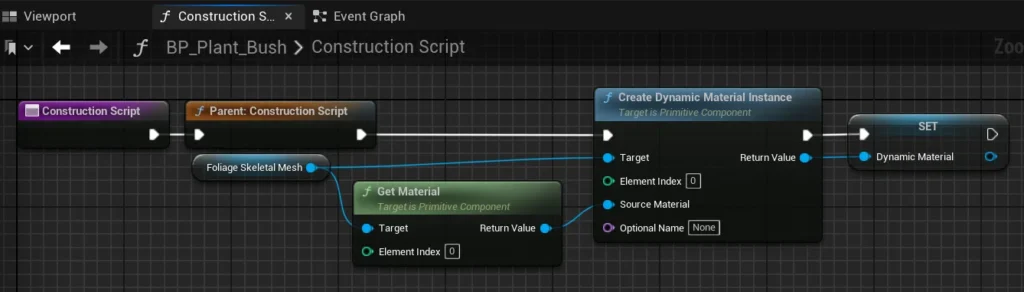 This process only needs to occur once, whether the plant is in the pool or in the level, so it’s best suited for the Construction Script or Begin Play of the foliage blueprint. This ensures the setup happens early, without needing to repeat it during pooling or reuse.