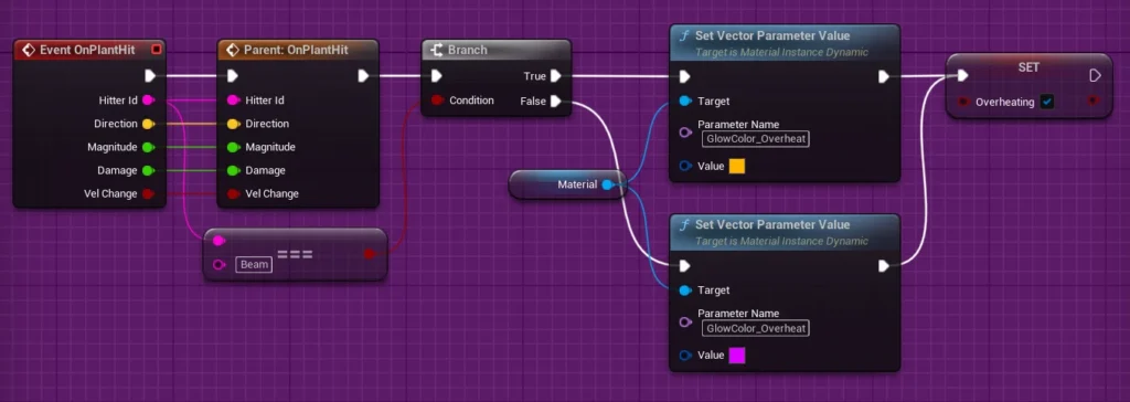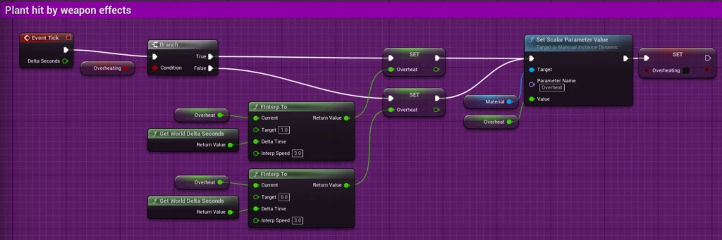 At the end of these nodes, we set the Overheating boolean to false, allowing the Overheating effect to automatically turn off. This works because Event OnPlantHit sets Overheating to true each time a hit occurs, ensuring the branch that checks Overheating will return true as long as the plant is actively being hit. When the hits stop, Overheating is set to false, and the effect gradually deactivates.
