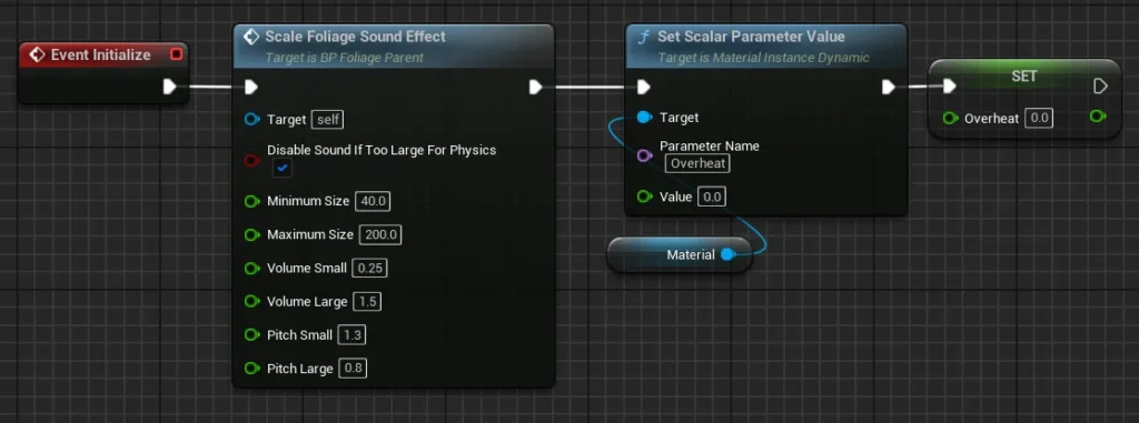 Finally, we use Event Initialize to reset the Scalar Parameter of the Dynamic Material Instance and set the Overheat float variable back to 0. This ensures that, each time the foliage blueprint is reused, both the material appearance and any overheating effects reset to their default states.