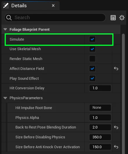 The Simulate checkbox determines whether the Skeletal Mesh is allowed to simulate physics when a Foliage Instance is converted to a Blueprint.