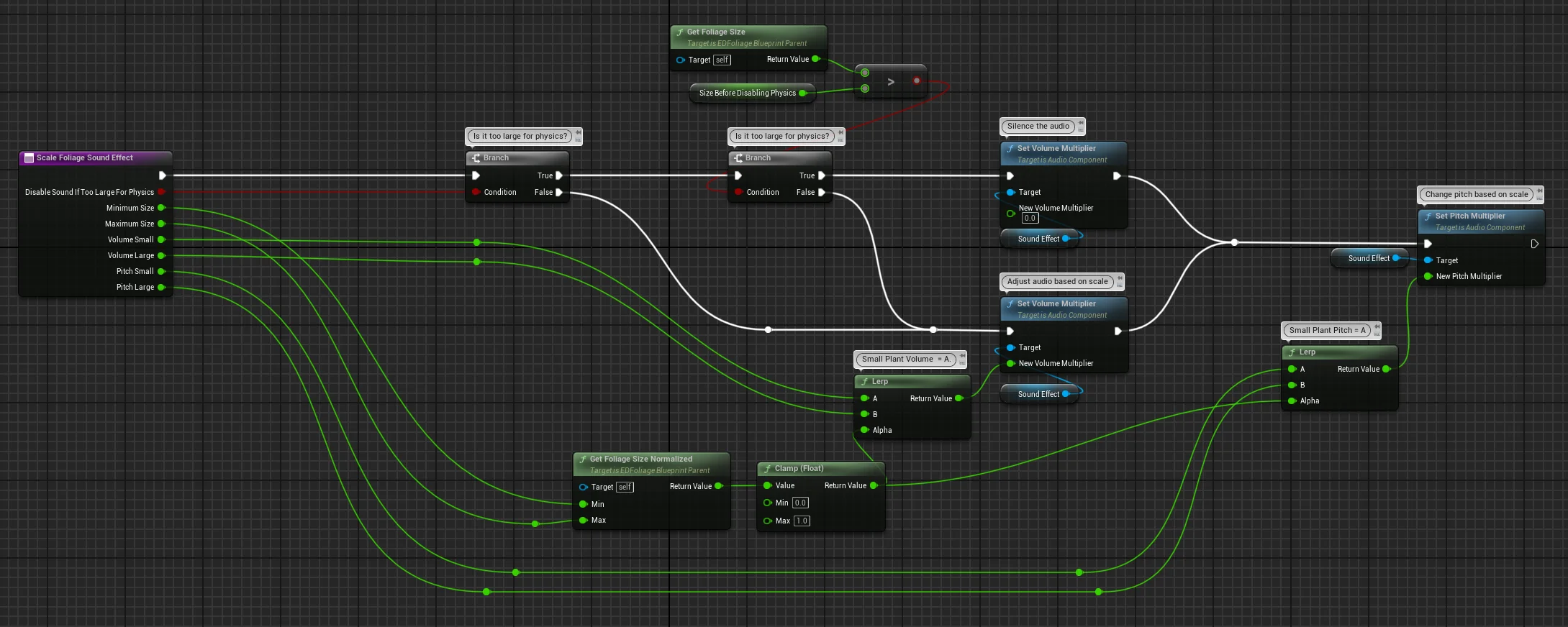 Here you will see the inner workings on how this function changes the sounds pitch and volume based on the foliage’s size.