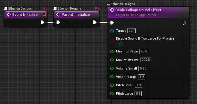 In the above example, we used Get Foliage Size Normalized to lerp between the minimum and maximum volume, and pitch variables for our foliage sound.