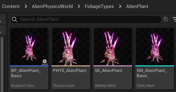 You can find these in their respective folders under Content / AlienPhysicsWorld / FoliageTypes
