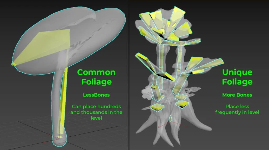 We recommend viewing our own pre-designed physics assets as examples of what settings are suitable for different foliage types.