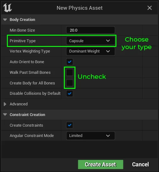 Uncheck “Walk Past Small Bones” and check “Create Body for All Bones” to ensure that each of your bones has a physics body.