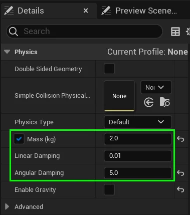 Optionally adjust the Mass, Linear Damping, and Angular Damping of each body, to make it seem like the bodies have the correct weight and resistance to movement.