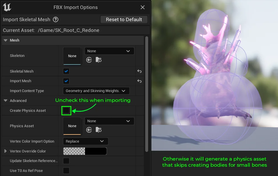 When importing a skeletal mesh, the default settings for “Create Physics Asset” will be checked. This isn’t optimal, as the importing will cause this auto-creation to ignore creating physics bodies for small bones.