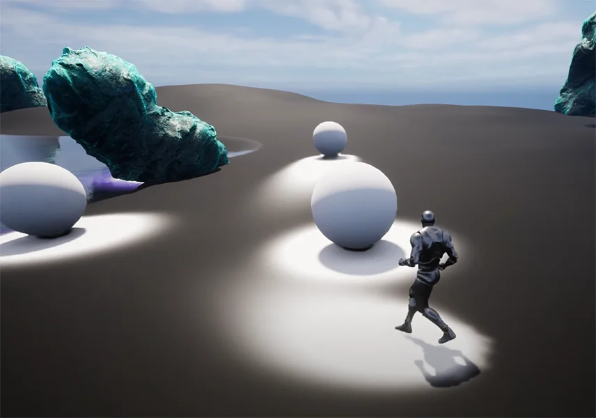 As long as the player remains on the ground, this blueprint reads the player’s world position into a material parameter collection called MPC_EtherionFunctions.