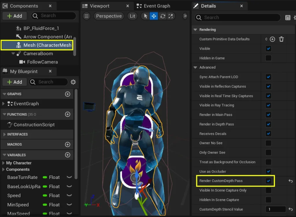 So naturally, you’ll want to select any character meshes or simulated objects and go into their details panels, and check “Render Custom Depth Pass”.