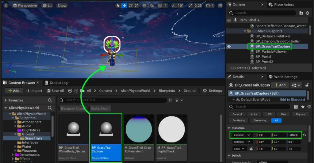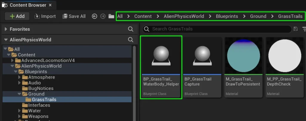 Navigate to Content / AlienPhysicsWorld / Blueprints / Ground / GrassTrails.