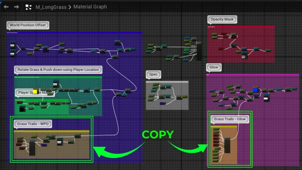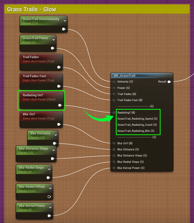 You’ll notice that the core material function used between both the WPO and the Glow function is MF_GrassTrail.