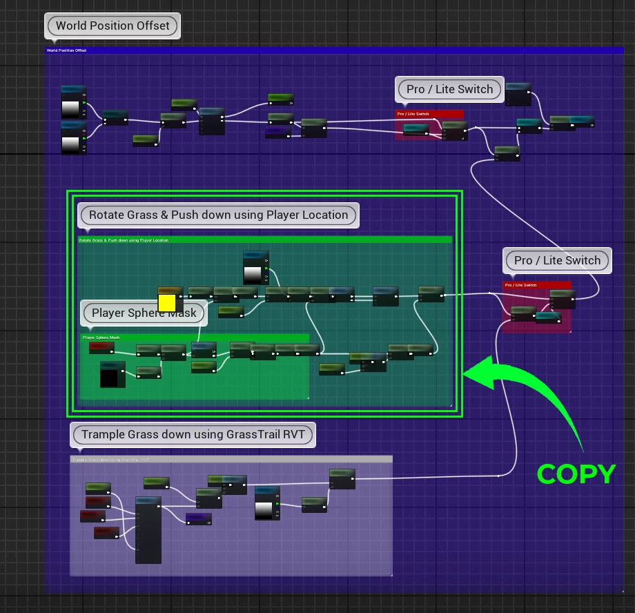 Copy the nodes shown in the provided image, then paste them into your own grass material. Ensure they are connected to the World Position Offset.