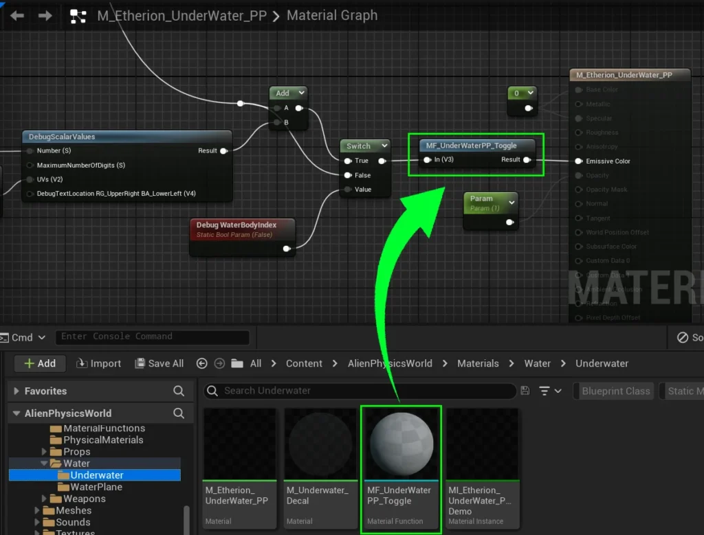 Drag MF_UnderWaterPP_Toggle from the content brownser into your custom postprocess material and connect it to the end of your nodes.