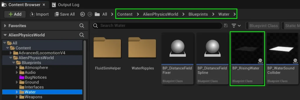 Navigate to Content / AlienPhysicsWorld / Blueprints / Water / WaterRipples /