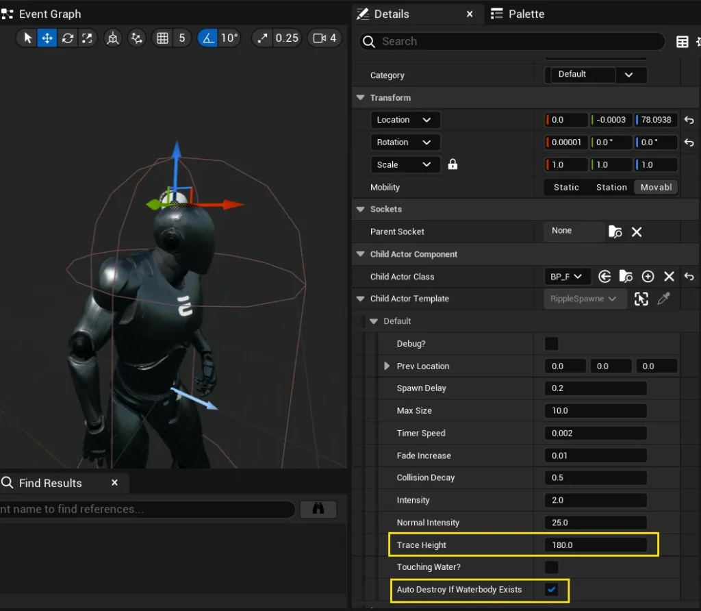 To ensure that ripples are spawned by your character or any other object, you’ll need to ensure that BP_RippleSpawner is added to your Character Blueprint.