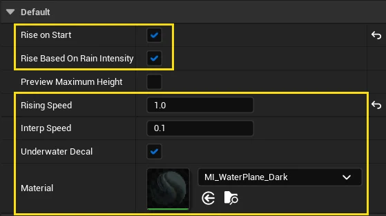 Auto Destroy if Waterbody Exists is a checkbox that automatically destroys the BP_RippleSpawner actor if a Waterbody exists in the level. This is useful if you have multiple levels which have varying water solutions.