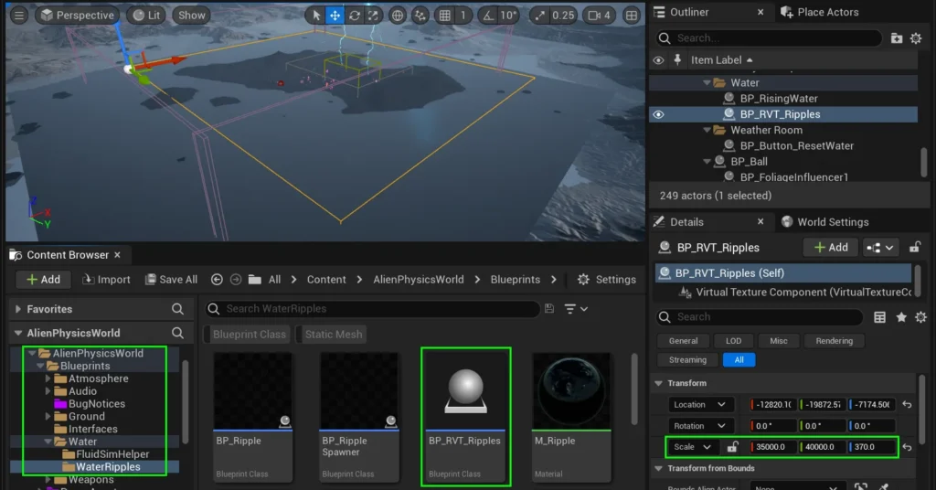 Drag BP_RVT_Ripples into your level, and modify its position and scale so that it overlaps the area that you want water ripples to apply to.