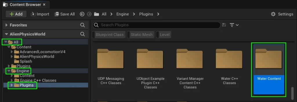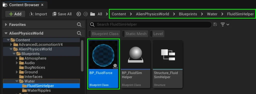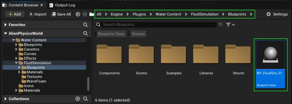 All / Engine / Plugins / Water Content / Fluid Simulation / Blueprints
