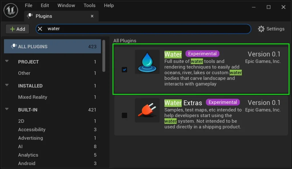Open your Plugins directory (Edit > Plugins), and search for “Water“.