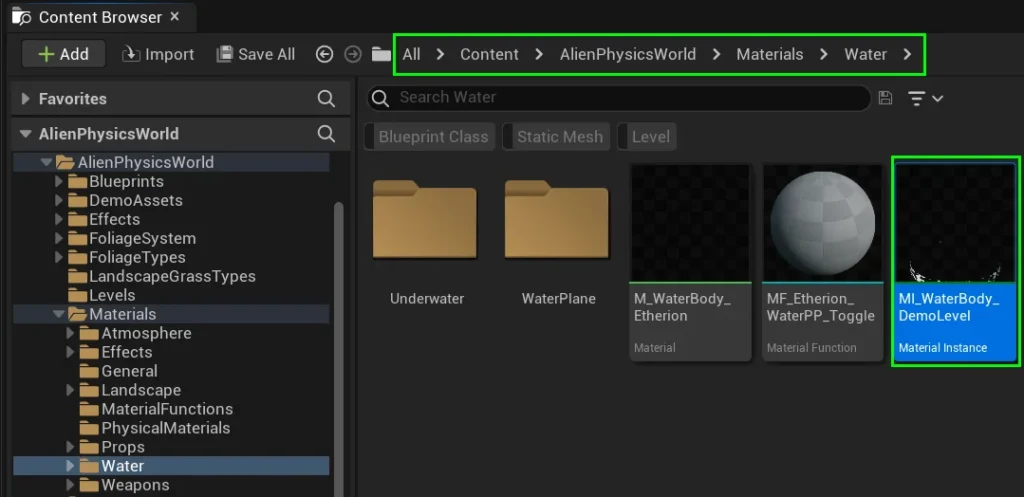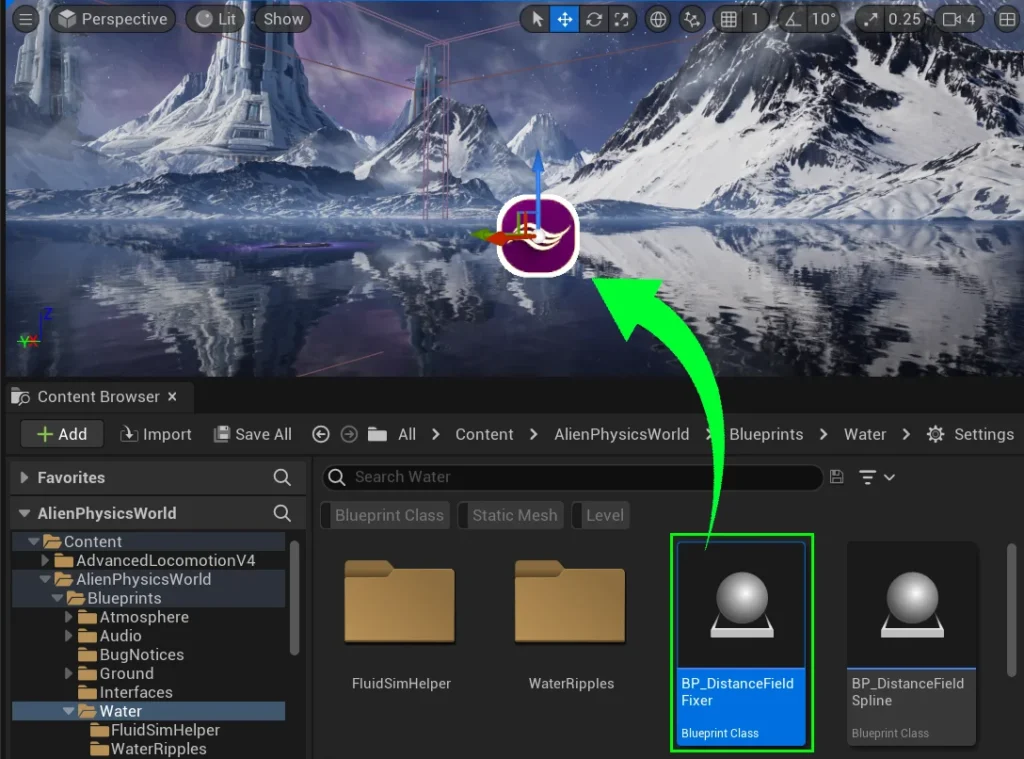 Navigate to Content / AlienPhysicsWorld / Blueprints / Water