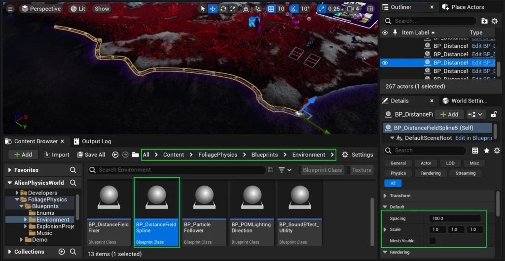 To get these glowing edges to appear, we created a blueprint tool called BP_DistanceFieldSpline.