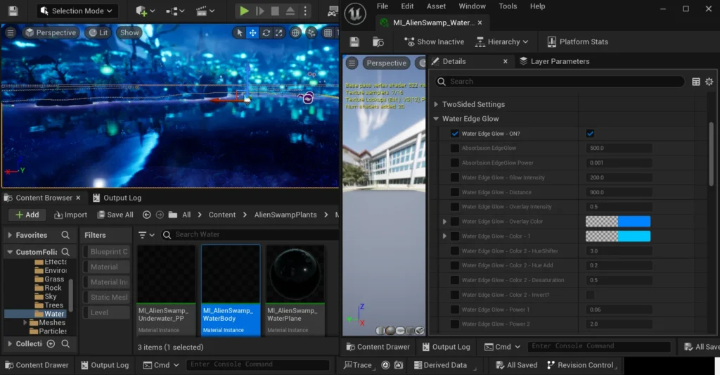 - Water Edge Glow – ON? – Enables distance field glow for the water surface.