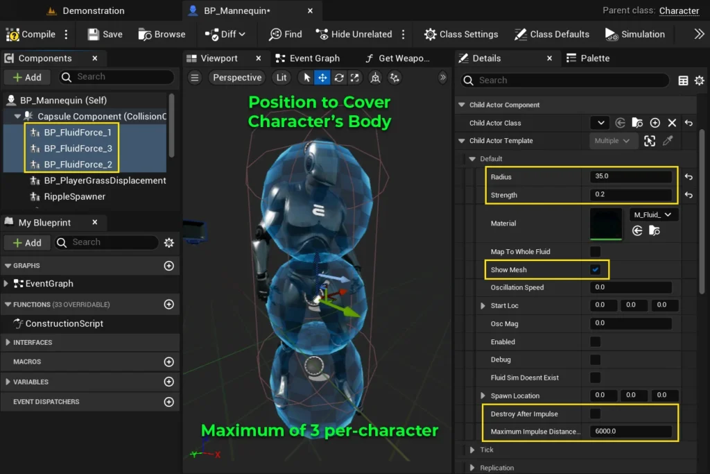 Open your player blueprint, and drag in BP_FluidSim_01, attaching it to your Capsule Component or root actor.