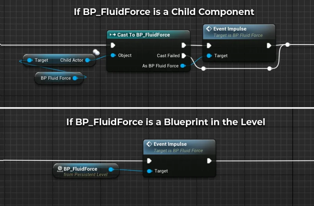 To trigger an Impulse, simply call Event_Impulse from your BP_FluidForce.