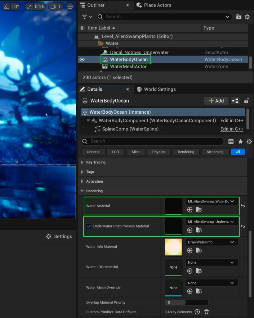 Unfortunately, Unreal Engine’s underwater post-process materials override the Scene Capture, disabling the grass trails!