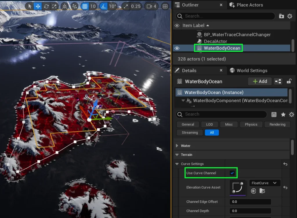 Because of this, the water material wont be detecting any distance fields from the landscape, and wont display any glowing edges around the shoreline.