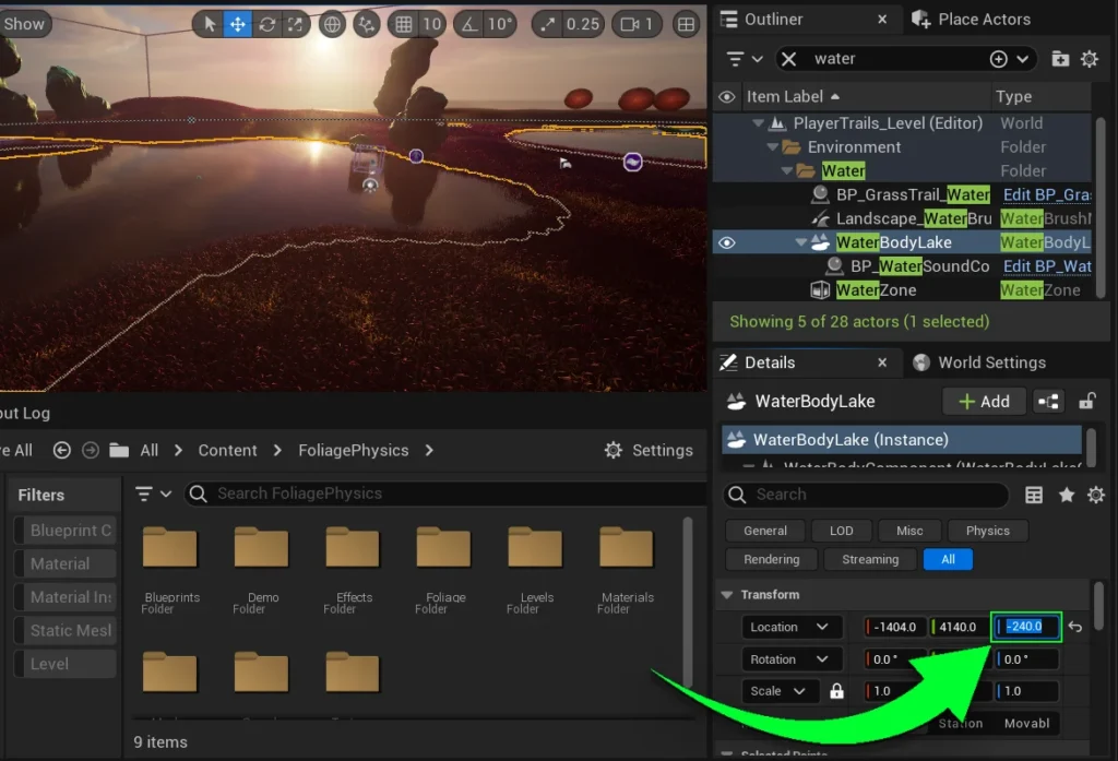 Next, use the Z Position box to add the correct value so that the waterbody in your level has a Z height of 0.