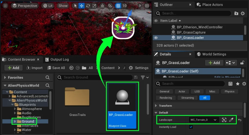 In the details panel, click the Landscape dropdown and select the landscape you want grass to instantly load into.