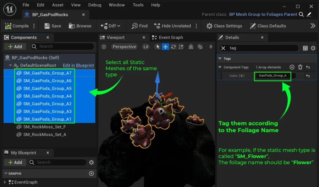 Then select each static mesh that is associated with a Foliage that is in your Foliage Map, and tag them according to their foliage name.
