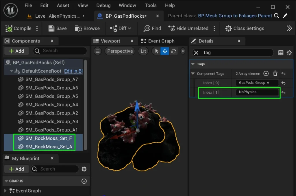 Any static meshes that you do not want to convert to a Foliage should have the tag “NoPhysics“.