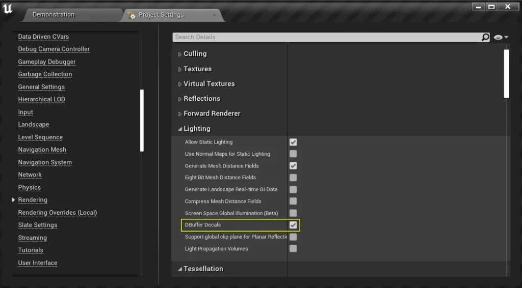 If you plan on using our water decal, which disables the specularity of everything that is underwater, please turn on “DBuffer Decals” in the project Settings
