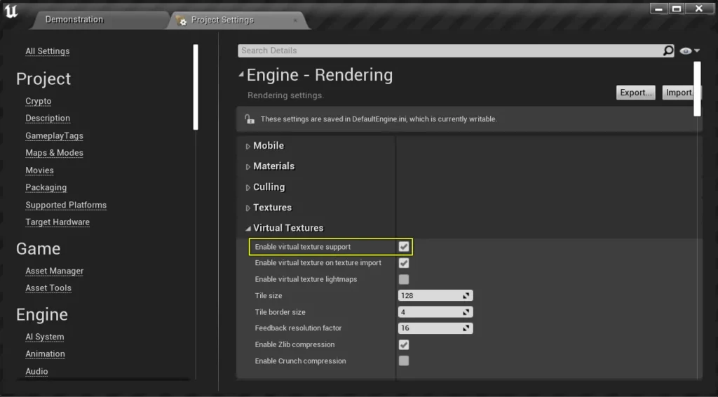 Project Settings > Engine > Rendering > Virtual Textures > Virtual Texture Support