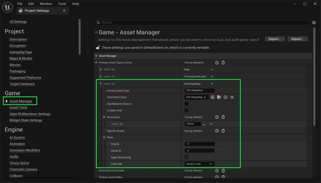 This ensures that the Foliage Map asset type is packaged along with the rest of the game.