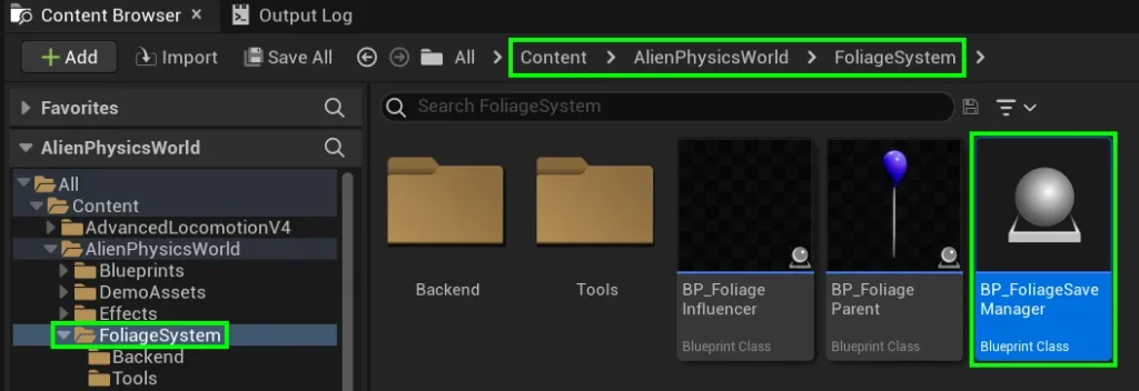 Drag a copy of BP_FoliageSaveManager into your level from Content / AlienPhysicsWorld / FoliageSystem